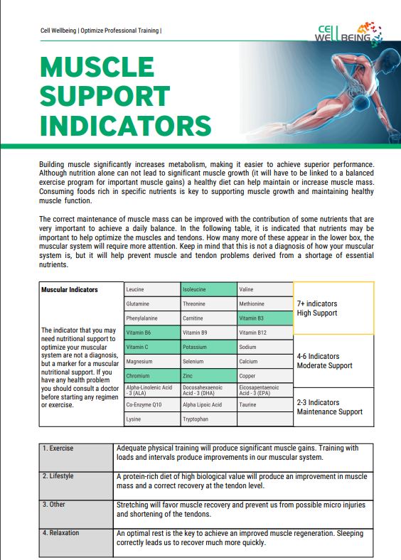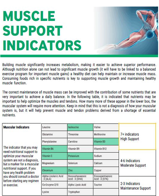 In the personalised Elite training Report, the nutrients are indicated that may be important to help optimize the muscles and tendons. Keep in mind that this is not a diagnosis of how your muscular system is, but it will help prevent muscle and tendon problems derived from a shortage of essential nutrients.